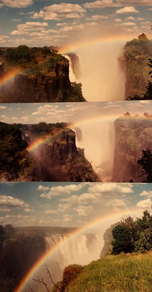 La meta finale però era il confine nord-ovest del paese con lo Zambia, laddove ci attendevano le maestose, rumorose e bagnate Victoria Falls dove una potenza di acqua mai vista spandeva nell’aria pulviscolo d’acqua che ci lasciò felicemente infradiciati. Oltre alle cascate la zona era popolata da numerosi babbuini che si mescolavano ad umani che non erano poi tanto diversi. Trascorremmo due giorni lì, il secondo dei quali corredato da una gita in barca sul fiume Zambesi, il fiume che poi si getta nel precipizio dando luogo alle cascate. La notte (o forse erano le notti) la passammo in un bungalow la cui particolarità era che non c’era l’elettricità per cui l’illuminazione era fornita da lampade alimentate a paraffina.