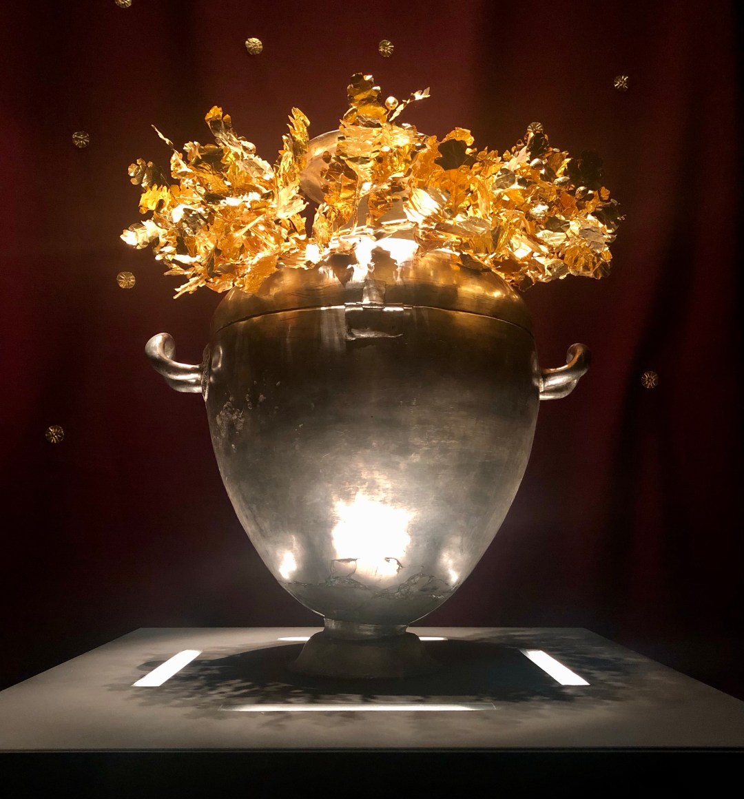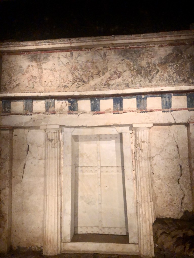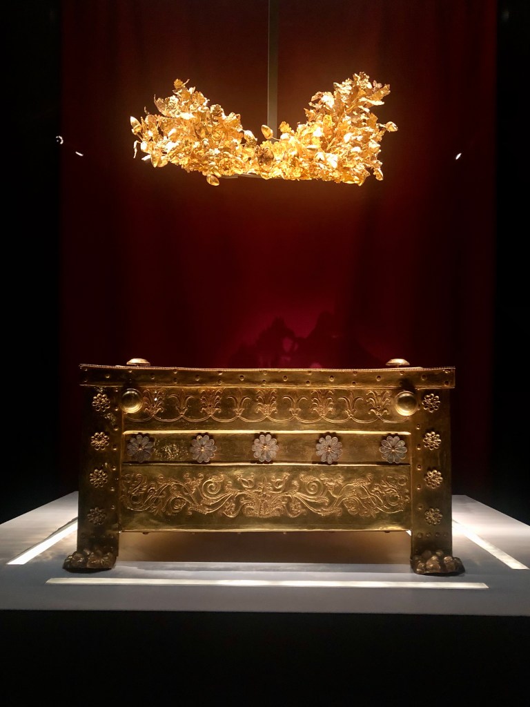 Il percorso si snoda sotto terra, sotto un tumulo per l’appunto. Prima sono esposte delle steli, poi dei vasi, poi alcune tombe minori, infine l’apoteosi: la tomba di Filippo II. Una cosa talmente inaspettata che potrei quasi scomodare Stendhal e la sua sindrome. E non era finita, nelle teche del museo erano conservati anche tutti gli oggetti che erano stati trovati all’interno di questa sorta di tempio sotterraneo: scudi, armature, spade, manufatti in ferro, bronzo, ceramica, per non parlare poi delle corone d’oro di foglie intrecciate. Una ricchezza, una finezza per cui avrei voluto poter arredare casa mia con buona parte di quel corredo funebre. E mentre mi trattenevo dal fotografare il fotografabile (io che generalmente detesto le foto ai musei) provavo a immaginare l’emozione incontenibile di chi quei tesori li aveva trovati.