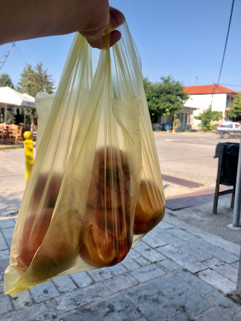 Tutta questa prima parte è stata scritta durante la prima delle circa due ore e mezzo di attesa del bus per Veria, senza ancora sapere se sarei stata in grado di arrivare in tempo per il bus per Salonicco. Mentre scrivevo ero all’ombra afosa di un albero, vicino a dei fondamentali bagni da usare per l’ultima volta prima di arrivare a Salonicco. Quando verso le 17 ho deciso di dirigermi verso il negozio del museo e poi alla ricerca di altri turisti a cui magari chiedere un passaggio verso Veria ho trovato il deserto. Taverne e negozi di souvenir senza avventori, solo il caldo che si insinuava in ogni poro della pelle. Verso il parcheggio del museo ho scorto un pullman, ho pensato potesse essere il mio che attendava la partenza, mentre mi dirigevo in quella direzione un venditore di pesche e fichi mi ha fermata. A gesti e poche parole mi ha tagliato una pesca, poi mi ha dato un fico, non aveva idea di dove fosse la fermata del bus ma si è fatto comprare un chilo di pesche a cui ho attinto per la mia merenda. Questo paragrafo lo sto scrivendo alla fermata che ho finalmente trovato, non era difficile, bastava andare dalla parte opposta a quella del fruttivendolo e chiedere in quello che pareva l’unico bar aperto o comunque frequentato della piazza. Ora sono qui, all’ombra della fermata, col termometro al sole dall’altro lato della strada che segna 39 gradi. Mi rinfresco in una fontana e intanto aspetto. Aspetto. Solo quando sarò sul bus per Salonicco mi sentirò tranquilla. E dire che da lì mi aspetta un’altra ora e mezzo circa per raggiungere il lato opposto della baia.