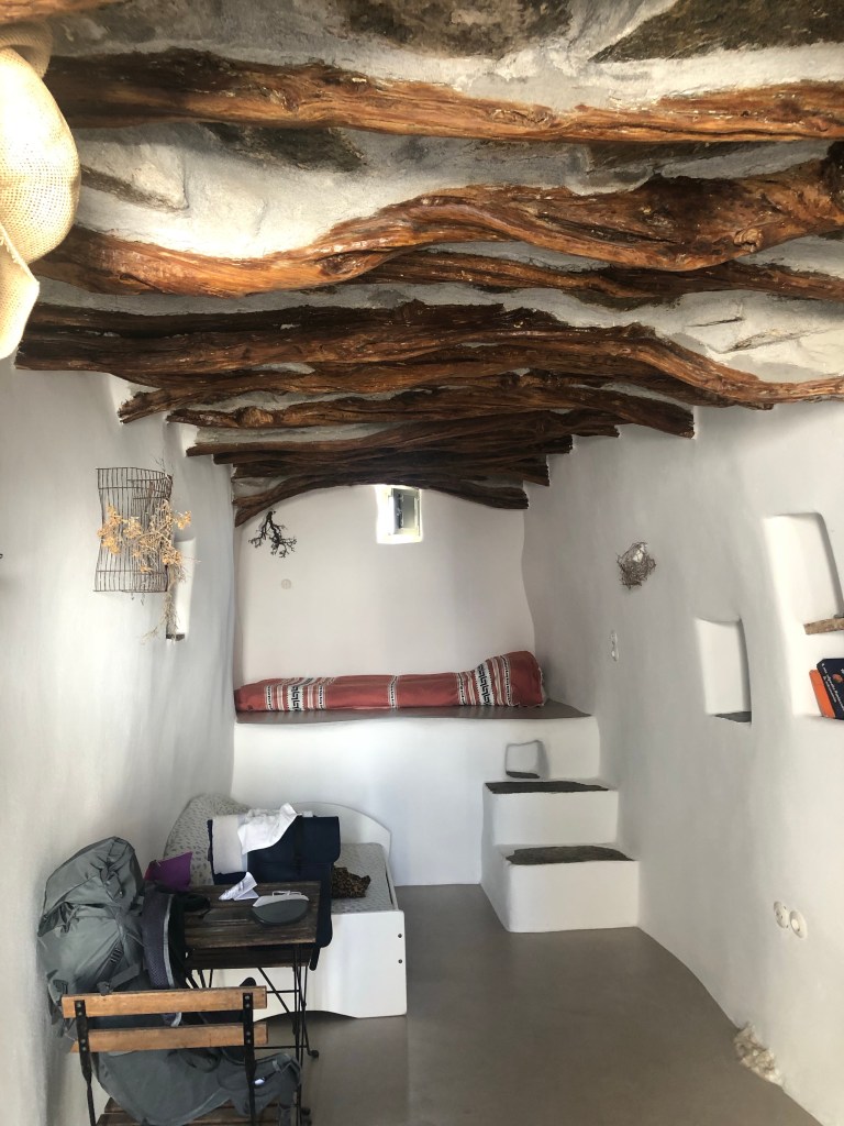 Il sole picchia forte ma il meltemi, il forte vento del nord, solleva anche la sabbia della spiaggia al porto. Mio cugino è venuto a prendermi in macchina e ci inerpichiamo fino a Kastro. Gli zii mi mostrano il mio piccolo appartamento appena ristrutturato, la “cicladica”: una stanza lunga e un piccolo bagno, con lavandino e angolo cottura. Infine mi siedo per un pranzo locale: pomodoro, feta e olive, l’unico pranzo che desideravo. E pensare che fino al mio viaggio a Creta manco le mangiavo le olive.