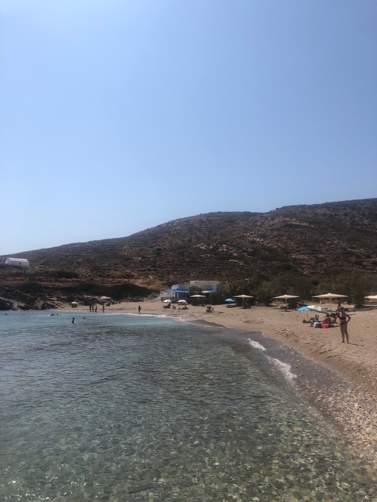 A Sikinos sto visitando una sorella di mio padre col marito, il loro figlio con moglie e due bambine e una coppia di loro amici con tre figli. Abitando lontani dal mare e con una sola macchina a disposizione l’organizzazione delle giornate prevede incastri meticolosi. Per oggi è stato deciso che io andassi con i bambini e la mamma dei tre alla spiaggia di Agios Georgios dall’altra parte dell’isola. Muniti di tiropite (pite al formaggio) pomodorini, pane, feta, patè di olive e dei dolcetti visivamente uguali alle formaggelle sarde ma poi diversi nel sapore, abbiamo percorso le curve che segnavano i pendii scoscesi dell’isola per giungere a una spiaggia attrezzata di sei ombrelloni gratuiti a disposizione di chi per primo arriva e vari alberi di ginepro sotto cui ripararsi dal sole. Sulla spiaggia c’è anche un ristorante e gli ombrelloni sono pesanti e praticamente cementati nella spiaggia per evitare che il vento li porti via. In effetti il vento soffia a raffiche molto forti tanto che più di una volta ci siamo trovate a inseguire oggetti sparsi sollevati dal vento. L’acqua di Agios Georgios è limpida e fresca, incastonata tra gli scogli e con una forte corrente che porta al largo. La tarda mattinata/primo pomeriggio è passato tra bagni coi bambini e poche bracciate che però mi sembravano le bracciate più rapide che avessi mai fatto.