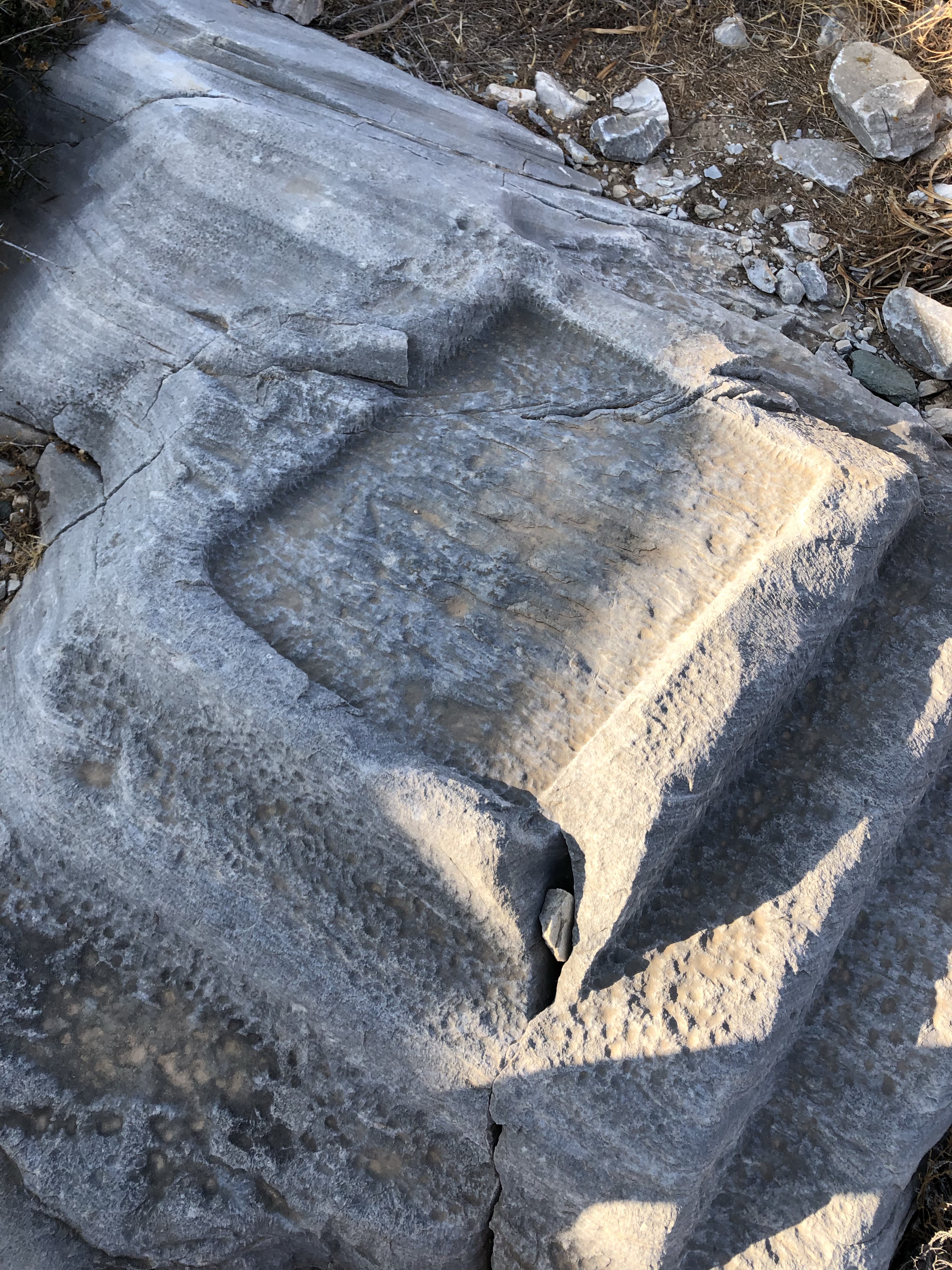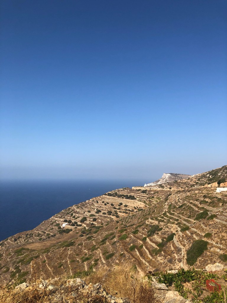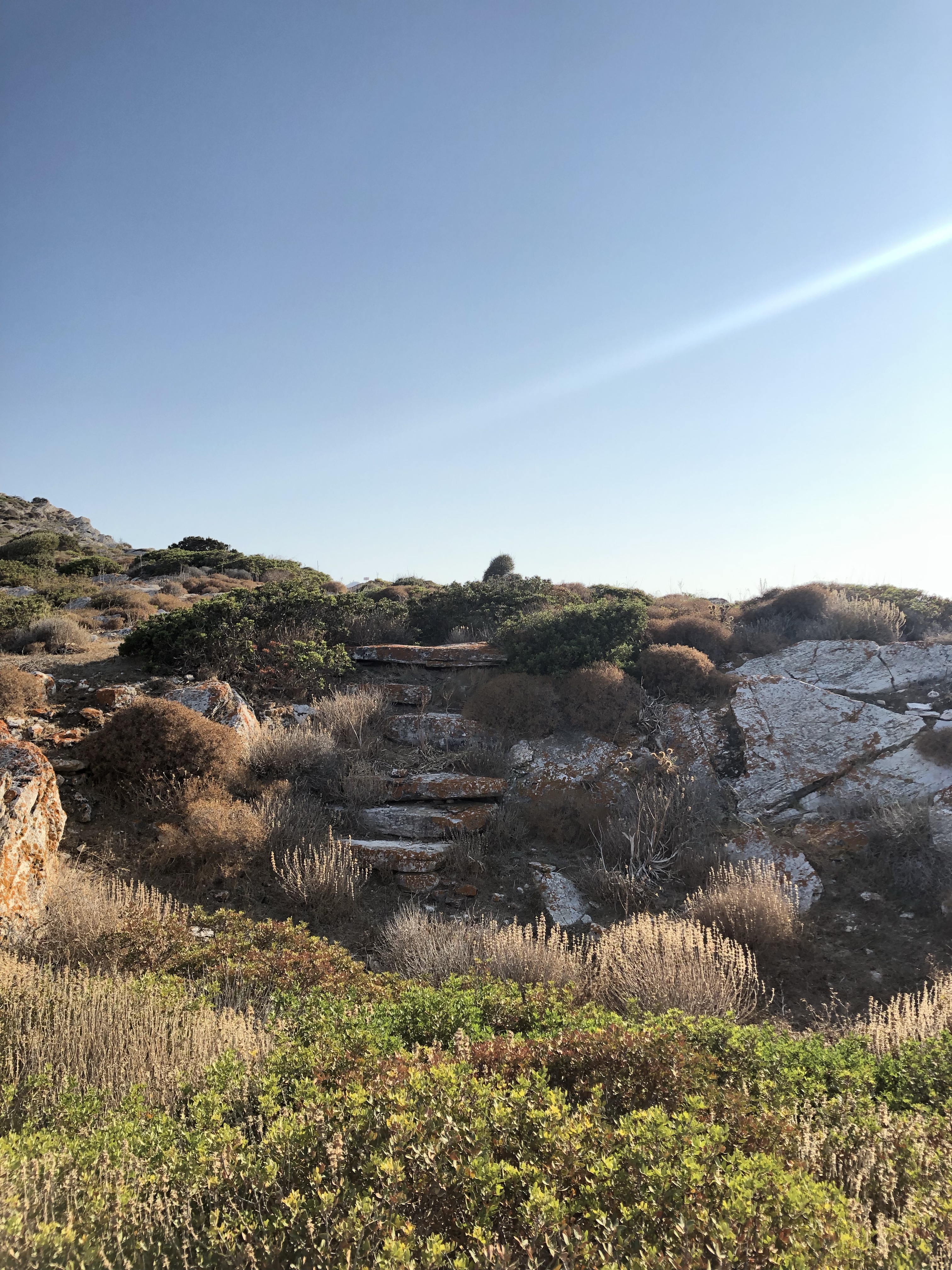 La passeggiata si rivela una sorta di ricerca archeologica, tra rocce in cui è intagliata una piccola vasca quadrata alta pochi centimetri accanto a una chiesetta e sul cui uso non sappiano niente, pezzi di coccio intorno ai ruderi del primo insediamento su Sikinos, delle grosse pietre disposte a scalini che scendono in quel che resta di quel che forse era una fonte.