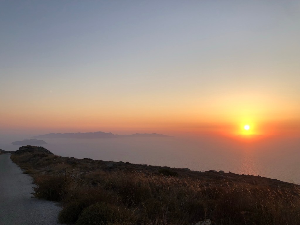 E così il pomeriggio si trasforma, il sole cala, la foschia si dirada e si vede il profilo di Folegandros davanti a noi. Tra un aneddoto e l’altro, la storia di Sikinos ci passa davanti agli occhi. Le fornaci, i ruderi, le chiese, i riquadri nella roccia in cui anticamente venivano convogliati gli sciami d’api, l’antica strada romana conservata perfettamente che si trova protetta sotto l’asfalto perché quando si è scelto di non aprire una nuova via tra le rocce l’unica soluzione era continuare a utilizzare la via romana. Ogni giorno qui si impara qualcosa e ci si immerge nell’atmosfera di quest’isola che non vive fuori dal tempo, vive proprio in un tempo suo, arcaico, immersa nel Mediterraneo e in quella sua civiltà di cui mi sento così profondamente parte.