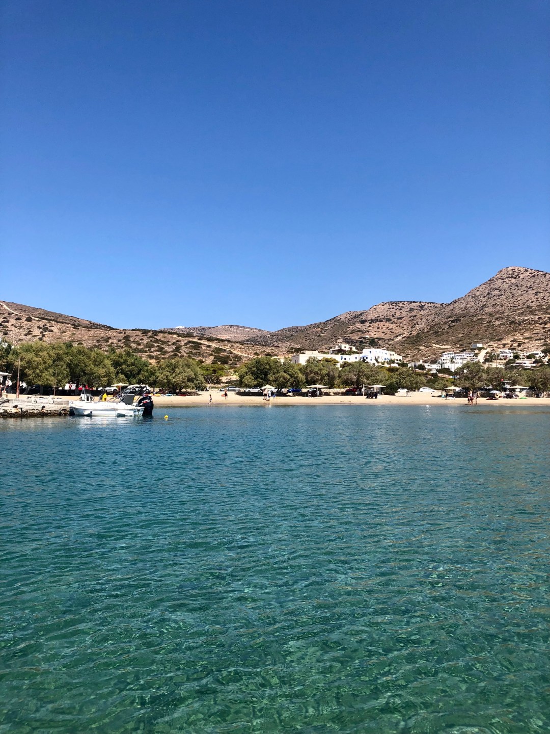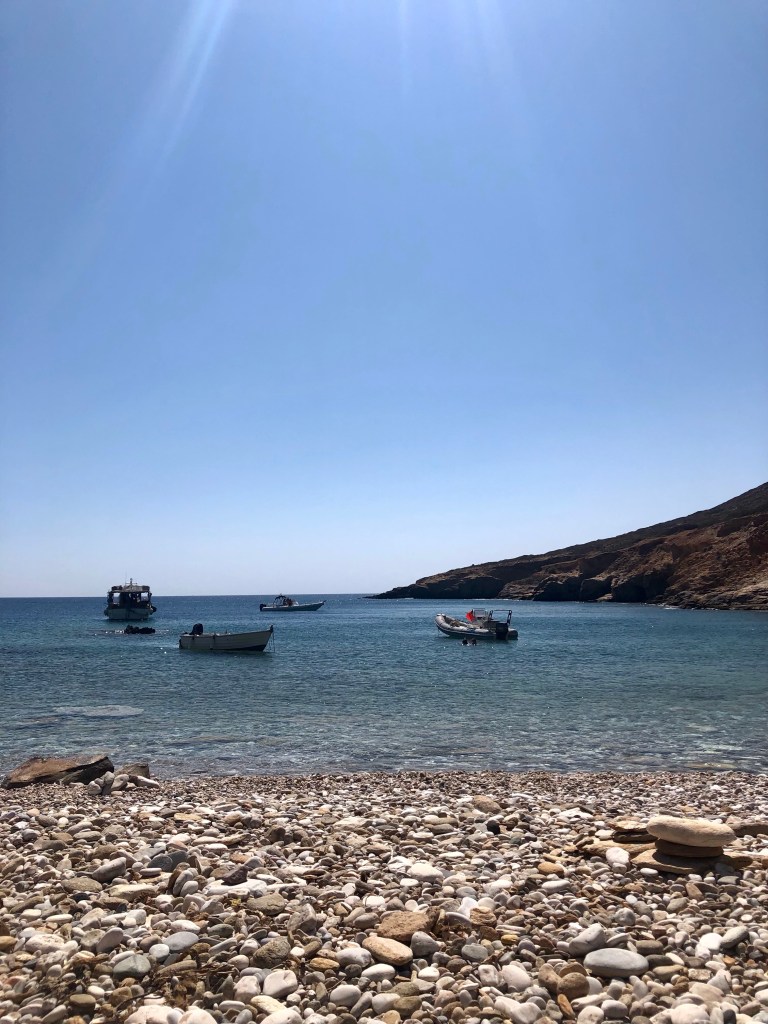 La cosa che mi stupisce di questo gruppo di vacanza è la quantità di storie o aneddoti da raccontare continuamente, le esperienze da scambiarsi. Le camminate in Nepal, il woofing in Irlanda, lo svuotamento di Parigi post covid, la pesca in Giappone, c’è sempre qualcosa da imparare. E intanto che il sole gira cambia la luce sull’acqua. Quando vado a fare il bagno dopo pranzo l’acqua rilascia un colore intenso di turchese e verde mescolati che uscire dall’acqua è un volersi male però dobbiamo andare, la bimba di un anno di mio cugino è rimasta coi nonni e non vorrebbe gravarli troppo a lungo, i miei zii sono qui da fine giugno e da circa metà luglio è stato un continuo via vai di persone. Nipoti, figli, amici, è un continuo movimento qua e tutti devono collaborare. Io sono andata via con la moglie di mio cugino, per fare più in fretta ci ha accompagnati Raphael, scultore francese innamorato di Sikinos, col suo gommone. La moglie è un’insegnante e per ora sono di stanza ad Atene dove insegna alla scuola francese.