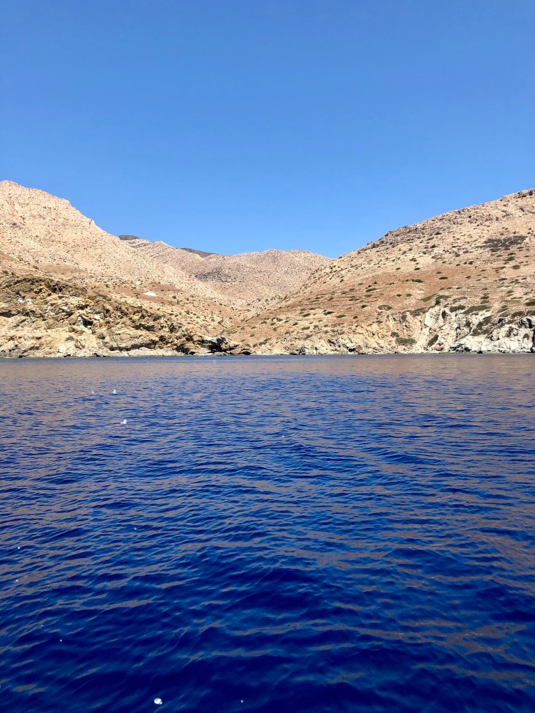 Per questioni di peso e sovrappiù numerico i bambini vengono mandati in gommone coi francesi, anche loro innamorati di Sikinos e proprietari di una casa qui da dieci anni. Noi adulti invece saliamo sulla piccola barca di mio zio. Costeggiamo la aspra Sikinos per un tempo che non saprei quantificare fino ad arrivare a una piccola baia appena prima di una punta dietro la quale suppongo si possa vedere Folegandros. Tra l’altro oggi l’aria è finalmente tersa e si scorgono benissimo anche Santorini e Naxos che nei giorni passati erano state avvolte dalla foschia. Dalla barca l’entità dei terrazzamenti e di quanto siano difficilmente accessibili certe cappelle è ancora più evidente.