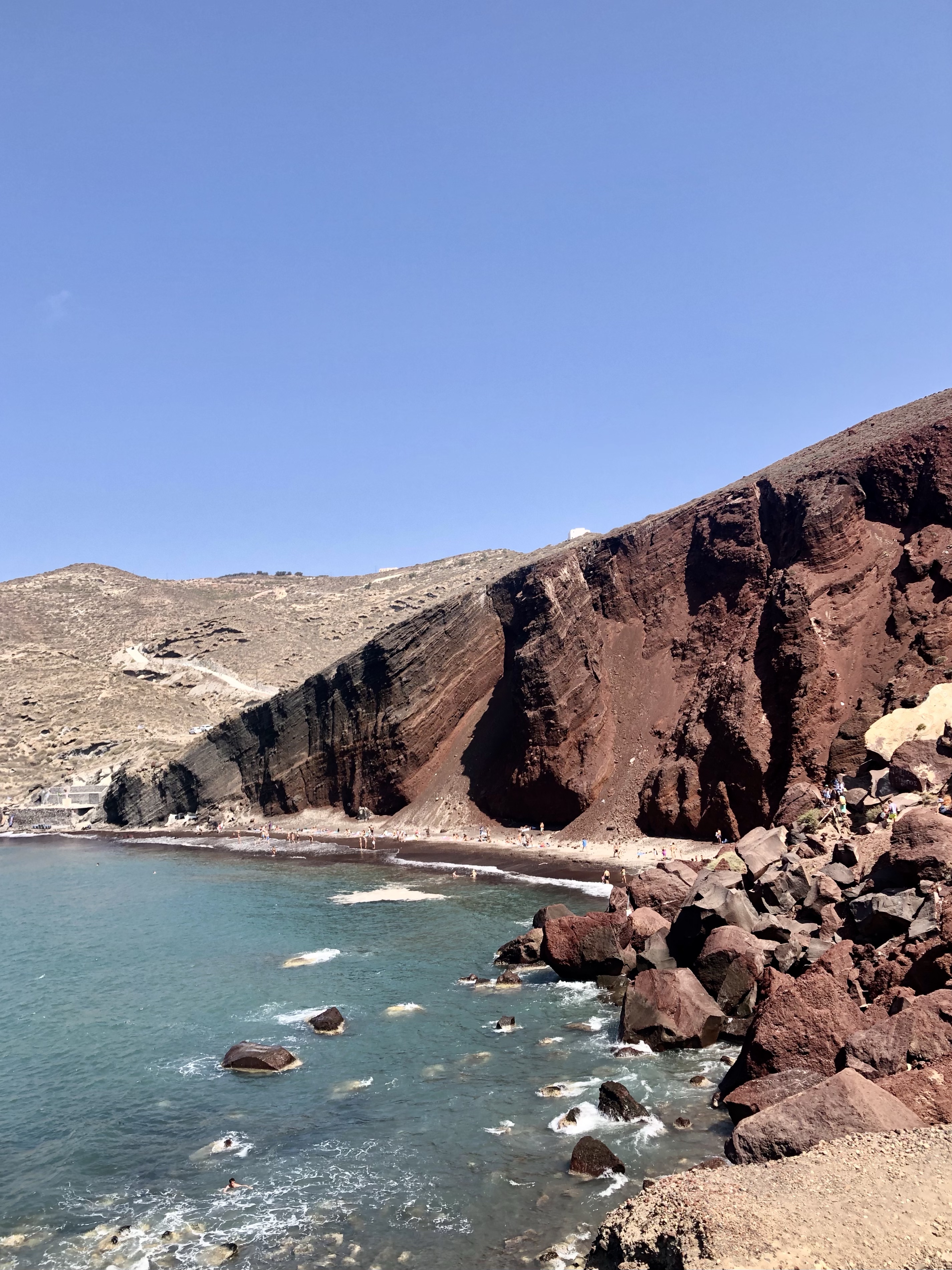 Scendo ad Akrotiri beach e seguo i cartelli per la spiaggia rossa, cercando di camminare sotto la poca ombra e trattenendo il respiro passando davanti a cassonetti che emanano un tanfo insostenibile.