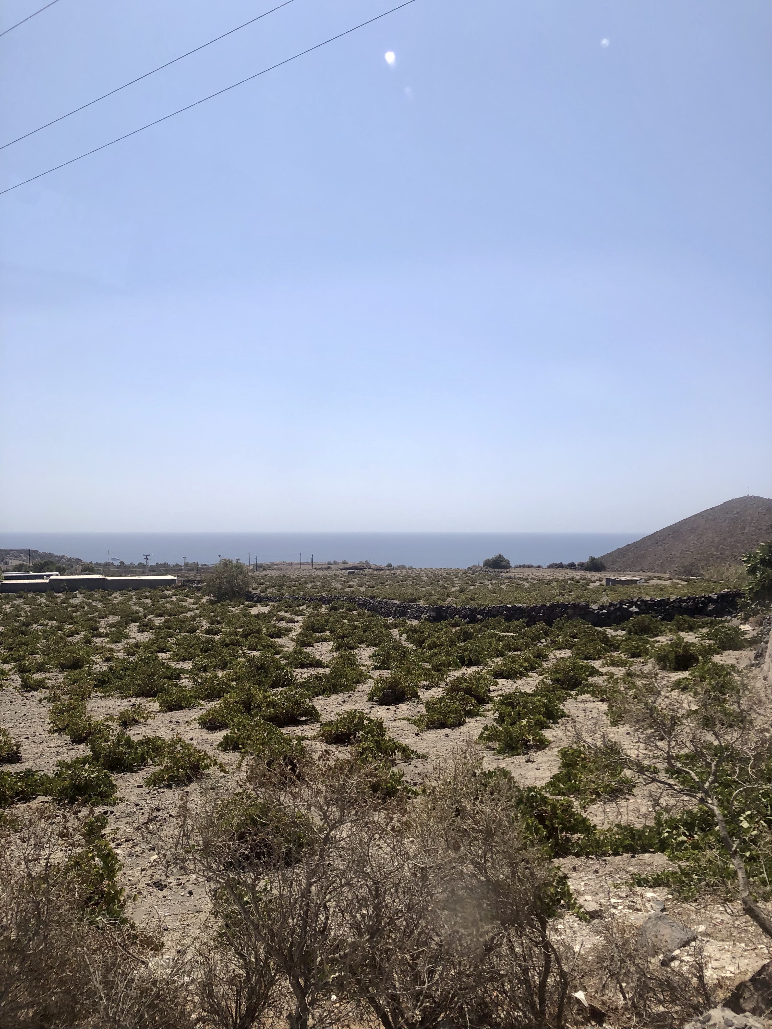 Alle 11 salgo sul bus per Akrotiri, non tanto per vedere il piccolo borgo o il sito preistorico quanto per farmi un bagno nella decantata spiaggia rossa. Lungo la strada rimango colpita dalle distese di vigneti che a malapena si alzano da terra. Niente a che vedere con gli ordinati filari toscani a cui sono abituata. Questo perché le piante si adattano alle condizioni climatiche del luogo in cui crescono e a Santorini soffia il vento.