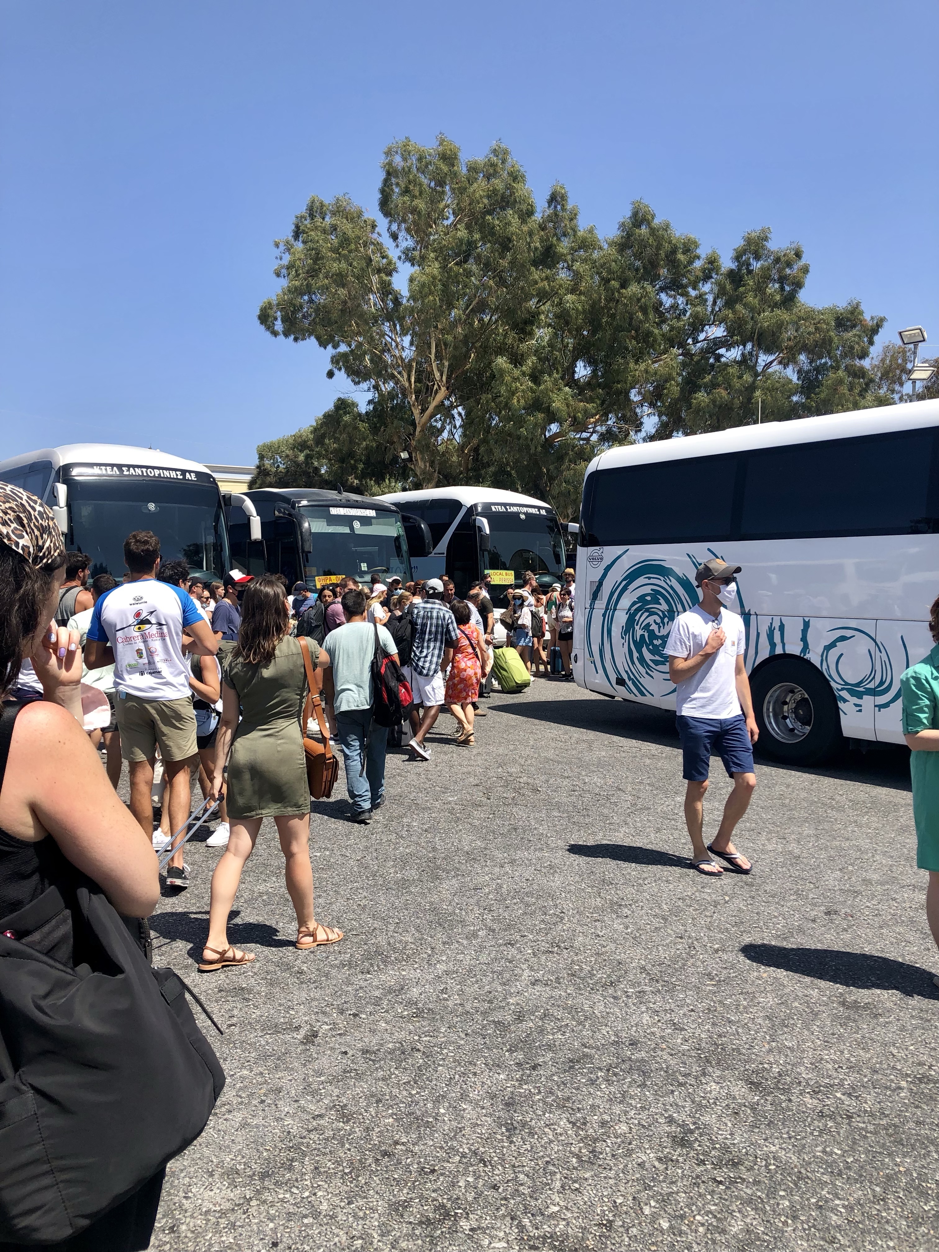 Intanto una menzione per la stazione dei bus: è una piazza di forse 40 metri per 40 in cui gli efficienti bus dell’isola vanno e vengono incessantemente infilandosi in retromarcia e partendo all’ora convenuta. Non tutti i bus hanno appoggiato al cristallo la loro destinazione e bisogna andare dall’assetto della stazione a chiedere qual è il bus per la destinazione desiderata. Senza neanche pensarci lei ha subito la risposta. “Number twenty” o “number sixteen”. Quando il bus è in partenza o lei o un’altra iniziano a urlare per richiamare l’attenzione sul bus che sta per uscire dalla stazione. I biglietti si fanno a bordo o, nel caso di Oia, appena prima di salire sul bus.