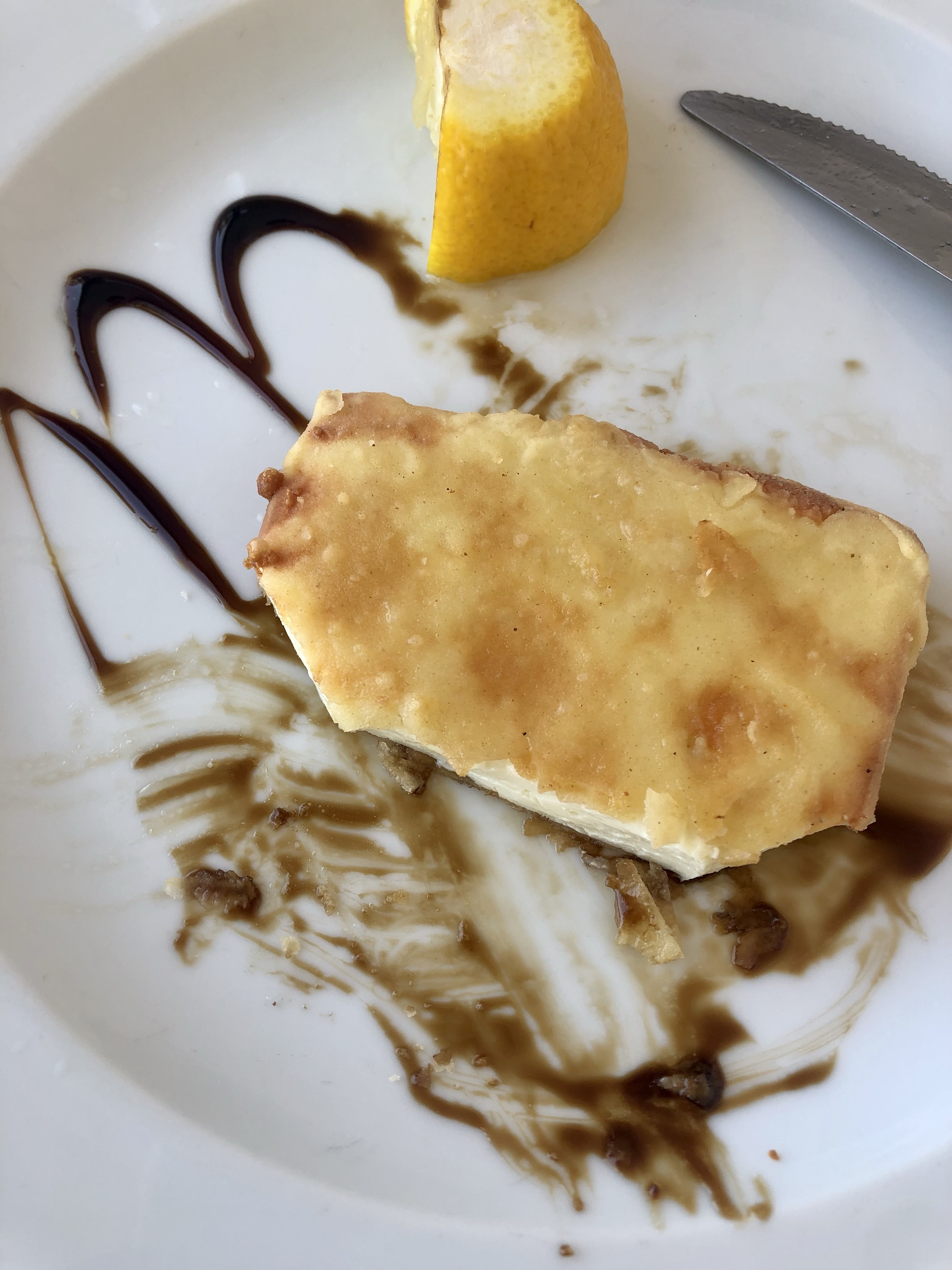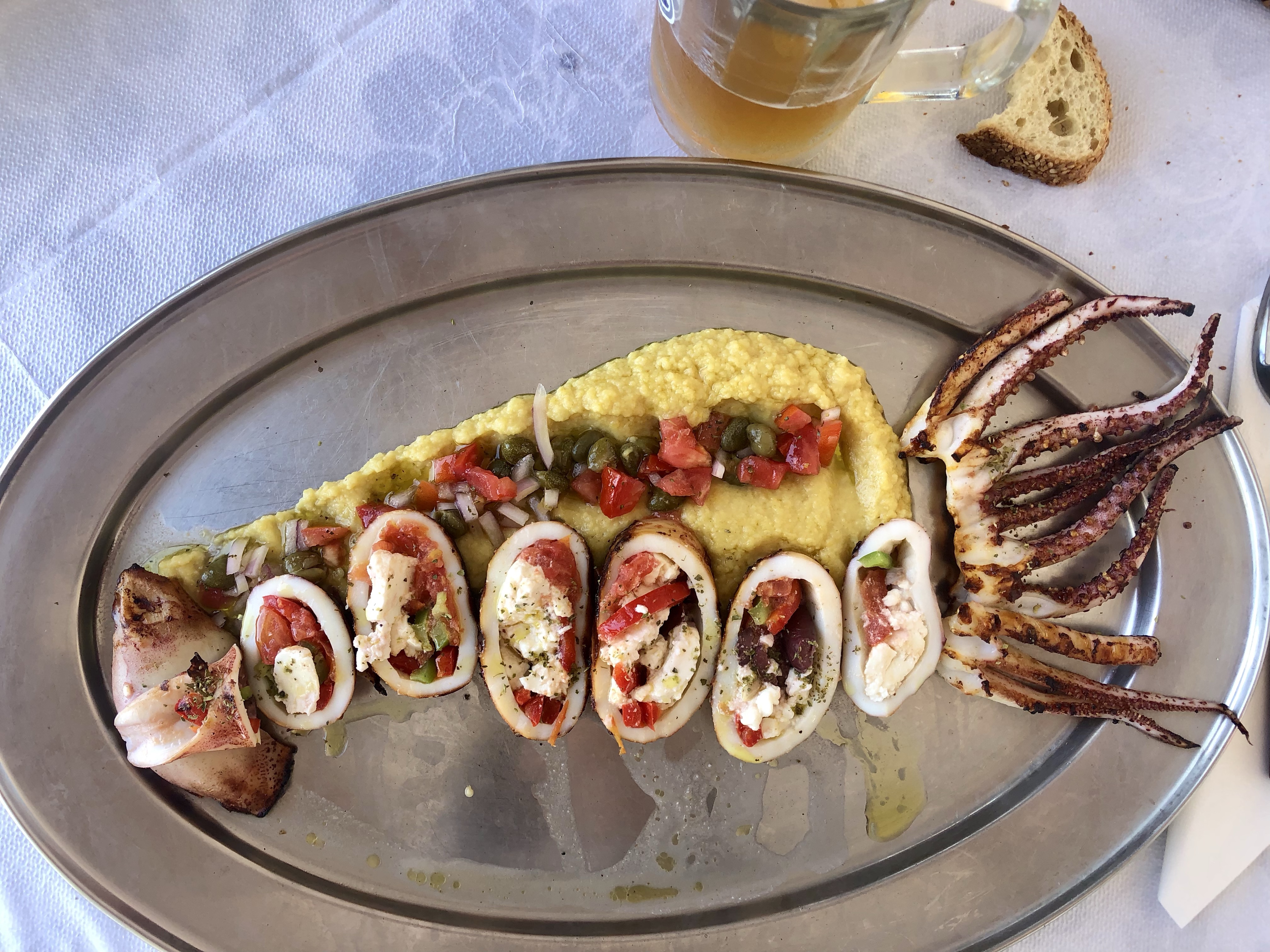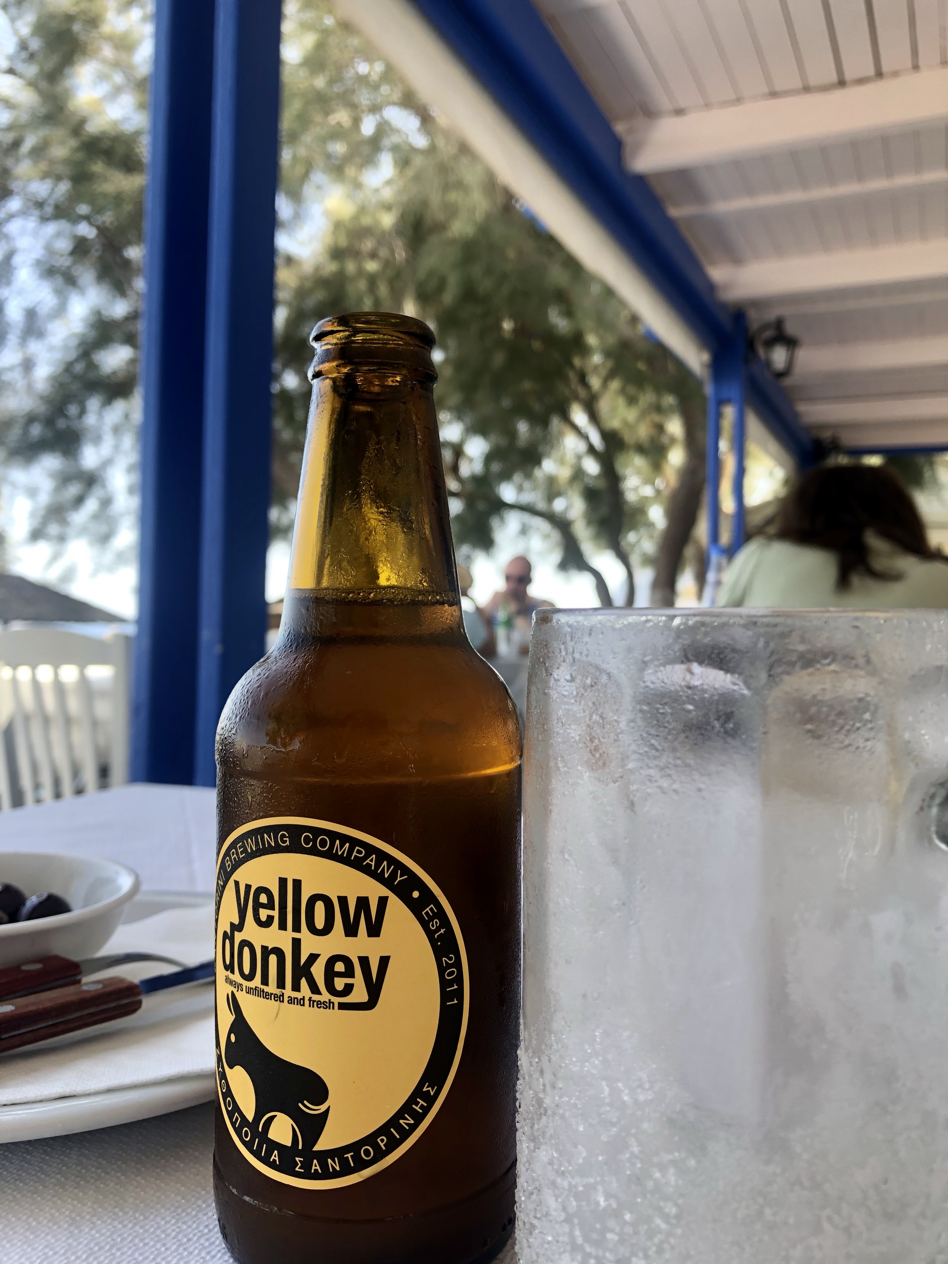 La sabbia è bollente e meno male nel dubbio ho portato scarpe da scoglio con cui raggiungere l’acqua limpida di un verde azzurro intenso. Dopo il bagno mi sciacquo il sale con una delle tante docce gratuite di cui sono provviste le spiagge libere greche e mi dirigo alla ricerca di cibo. Per questa ultima giornata di vacanza ho deciso di concedermi un pasto vero al ristorante, costi quel che costi. Percorro buona parte del lungomare di Kamari prima di fermarmi al Sea view steak house and restaurant dove esagero e ordino un tira saganaki (un formaggio fritto e servito con uno spruzzo di aceto balsamico e limone) e un calamaro ripieno di pomodoro, feta, peperoni e olive, servito con purè di fave, cipolle e capperi. Il tutto bagnato da una Yellow donkey, una birra artigianale locale.