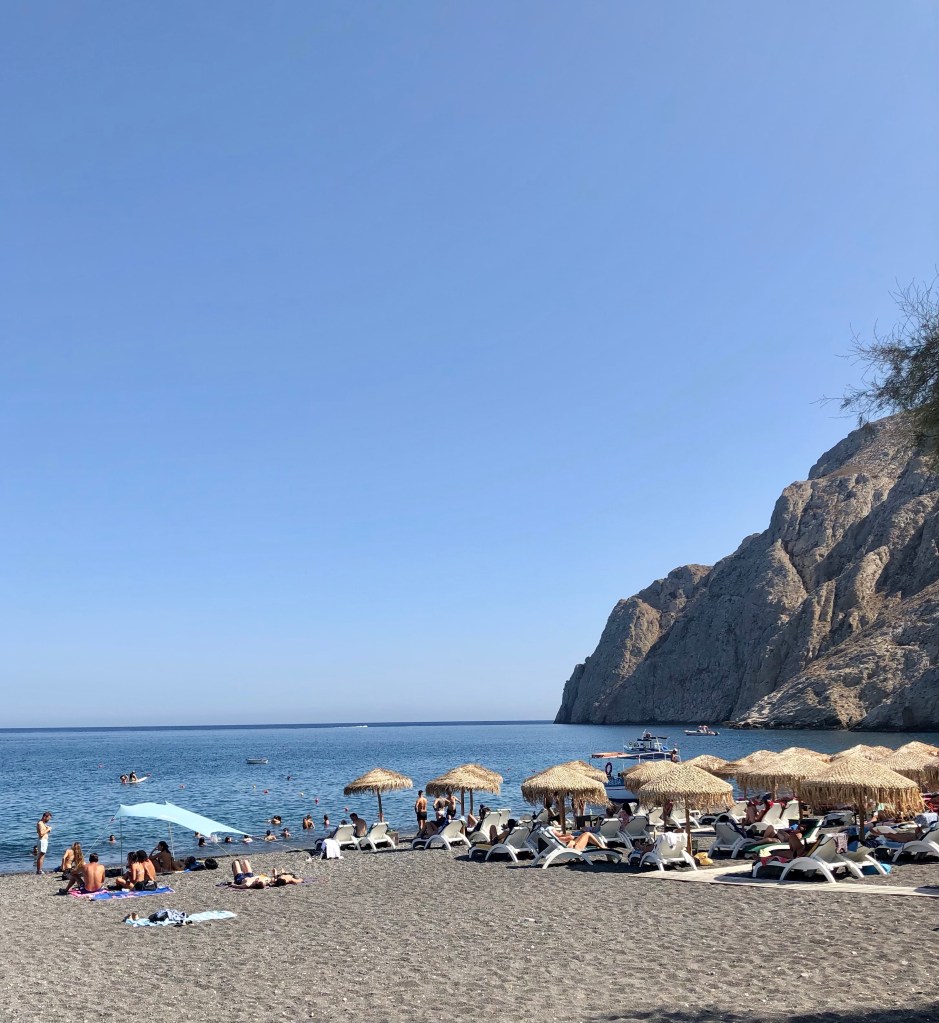 Kamari è una lunga distesa di pietra lavica nera, costellata di ombrelloni e ristoranti. Ciononostante riesce ad essere tranquilla e senza schiamazzi. Se durante il mio riposino pomeridiano non ci fosse stata la musica di qualche locale sul lungomare sarebbe stata perfetta.