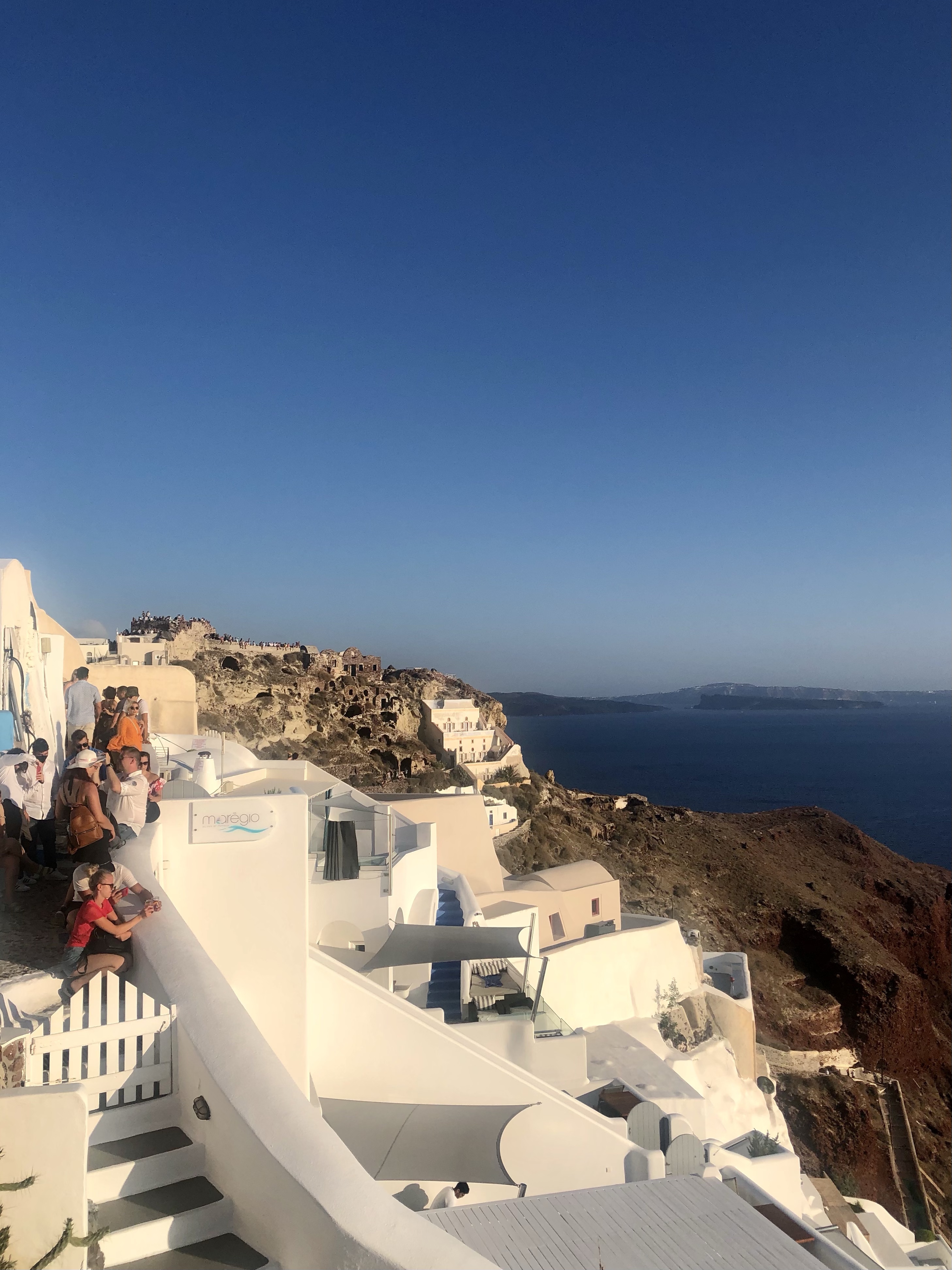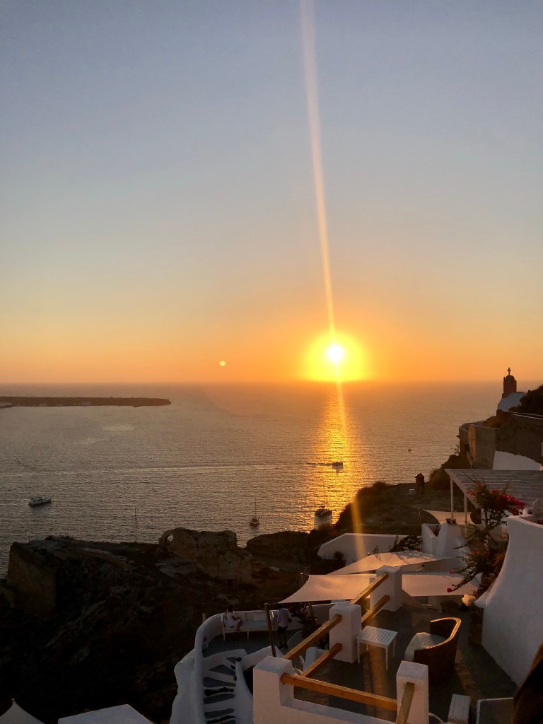 Le stradine di Oia sono già affollate, io mi dirigo verso il punto estremo pensando che non sarà ancora stato raggiunto dalla ressa. Mi fermo a prendere una lattina di birra e in effetti trovo posto a sedere su un muretto. Per trovare posto a sedere sono arrivata presto, ancora prima delle 19, ho ancora un’ora da trascorrere. Allora inizio a scrivere della mia giornata. Intanto arrivano altre persone, via via che si avvicina l’ora del tramonto la bocca della caldera si riempie di catamarani e un veliero appostati per vedere il tramonto dal mare. Di sotto le case ricavate in caverne nella roccia di Oia e trasformate in lussuose strutture ricettive snocciolano tutto il loro lusso. Infinity pool, tappi di bottiglie che vengono fatti saltare, tutto l’immaginario della ricchezza.