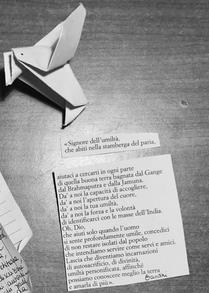 Possibile. Possibile anche che quando la sera sono rientrata a casa e ho trovato un suo bigliettino di ringraziamenti e una preghiera di Gandhi che le aveva fatto pensare a me, ho realizzato che il tempo era volato e che probabilmente ci eravamo perse le conversazioni più interessanti. Non potevo immaginarlo del tutto ma quella preghiera era la base della mia seconda vita di settembre.