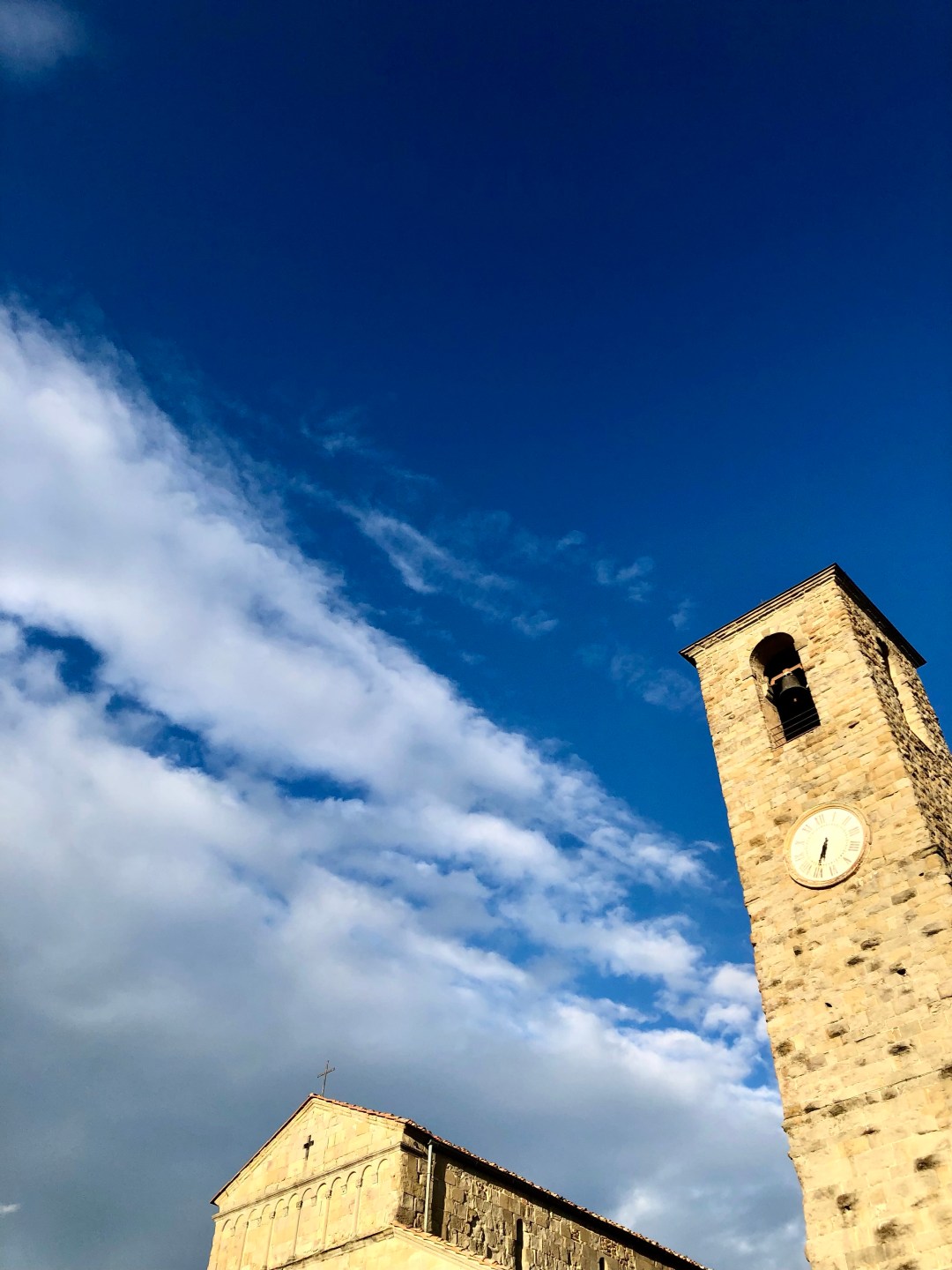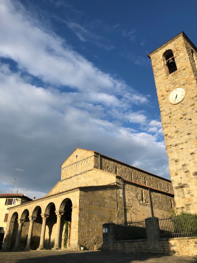 Giusto il tempo di posare gli zaini e siamo ripartite in macchina verso la pieve di San Piero a Cascia dove il prete più giovane avrebbe detto messa. Eravamo in anticipo e nell’attesa mi sono lanciata verso la cosa più vicina a quella che è stata per più di un decennio la mia religione domenicale: il campino dell’oratorio adiacente alla chiesa. Quando dico lanciata, intendo proprio lanciata perché non ho camminato verso il pallone al centro del campo, ho proprio corso, nonostante la decina di chilometri sulle gambe. Ma anche la questione del calcio occuperà un’altra vita. Per ora basti sapere che mi sono sentita con la stessa gioia di una bambina e che ho abbandonato il campo giusto in previsione dei molti chilometri del giorno successivo, e poi perché sono arrivati dei ragazzini e mi è parso doveroso lasciare il campo a loro per tornare dalle due sorelle che nel frattempo si erano sedute su una panchina di fronte alla chiesa in attesa delle 18. Ho tirato fuori anche io il libro che stavo leggendo ma ho finito per cominciare a discorrere di fede con M. molto interessata al mio percorso e a mia madre che alla mia domanda sull’esistenza di Dio (legata alla scoperta dell’inesistenza di Babbo Natale, Befana, fatina dei denti) mi dice che è questione di fede, che se ci credo c’è ma se non ci credo non c’è. La conversazione stava per entrare nel vivo quando uno sguardo all’orologio ha interrotto lo scambio: mancavano pochi minuti alla messa. Così le ragazze sono entrate in chiesa mentre io sono andata a cercare una gelateria in cui acquistare del gelato da portare a cena.