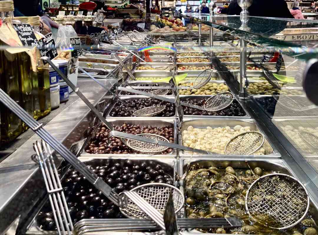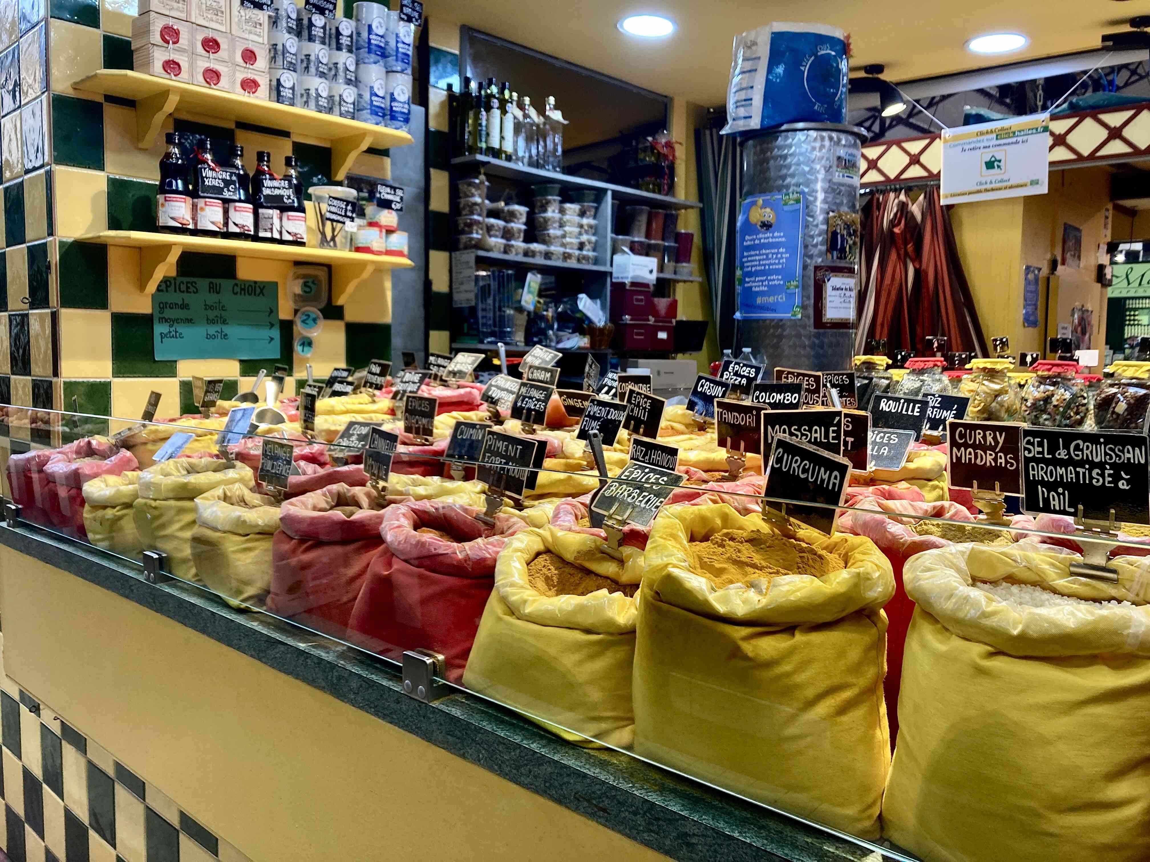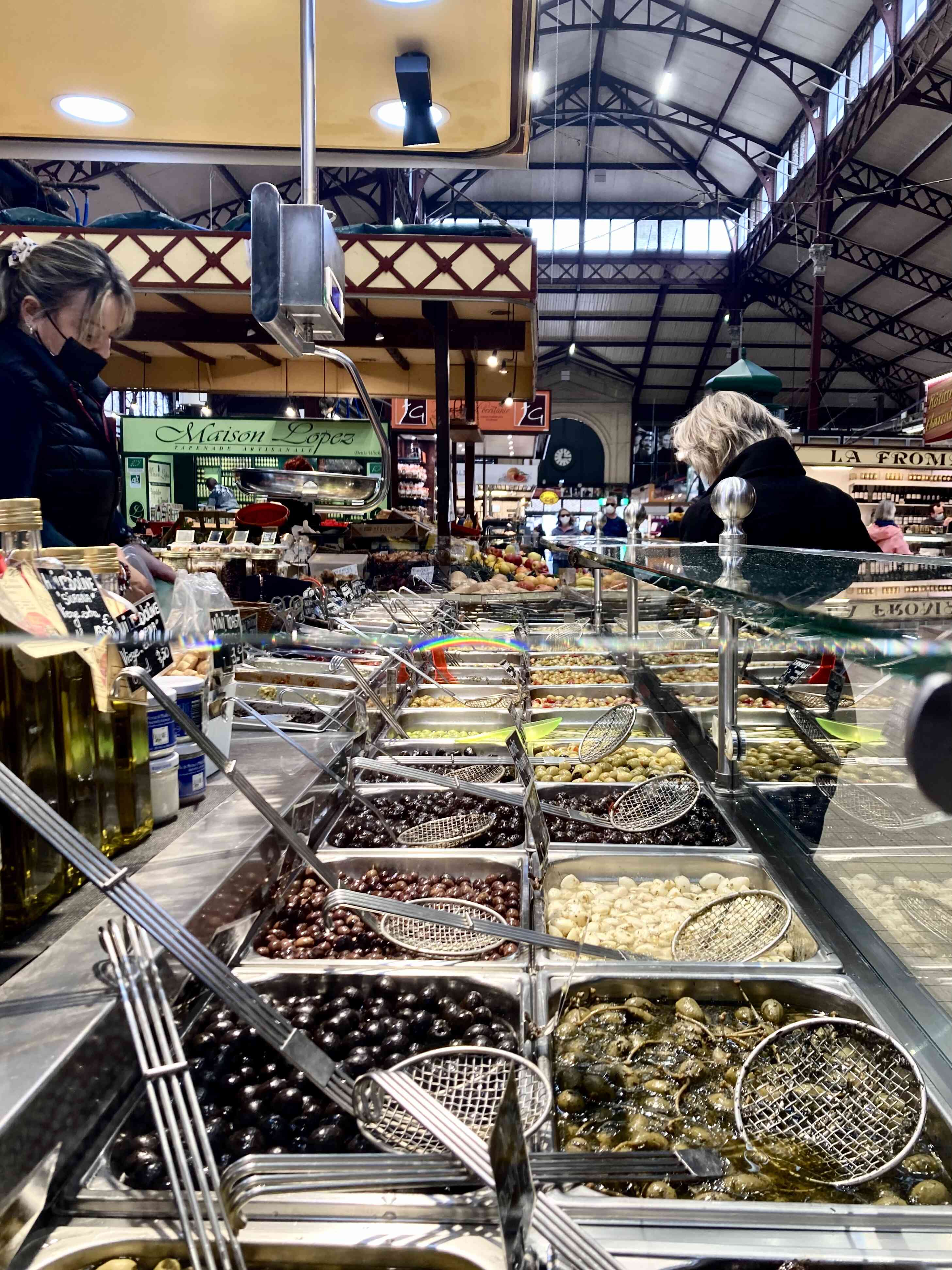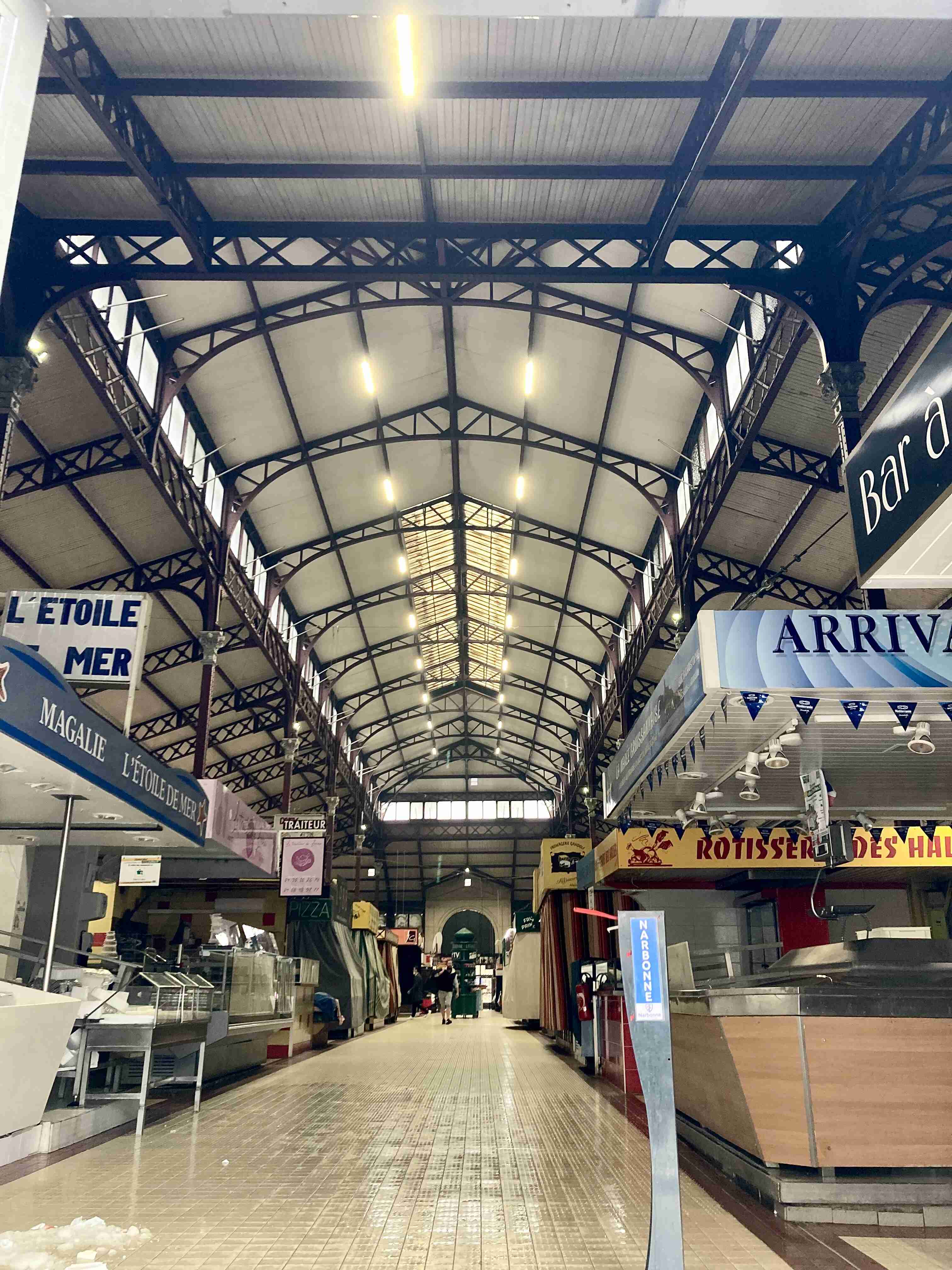 La cucina non riveste la stessa importanza che rivestiva in casa di Tanya e Jonathan. Là gli armadi straripavano di cereali, noci, tè e tisane, Malcolm raccontava che era stato da un amico pochi giorni prima e, aprendone il frigorifero, era riuscito a vedere il retro degli scaffali di un frigo per la prima volta dopo non ricordava quanto tempo. Qua il cibo non sembra avere lo stesso ruolo centrale, gli avanzi si possono mangiare riscaldati anziché rielaborati, i pasti sono più semplici e Sylvie non ha tutto quel bisogno di dessert anche se quando li trova, due croissant per la colazione li prende. Ieri però, poiché doveva andare dall’acupunturista a Narbonne, siamo uscite un po’ prima dell’appuntamento in modo tale da pranzare a Les Halles, il mercato coperto della città.