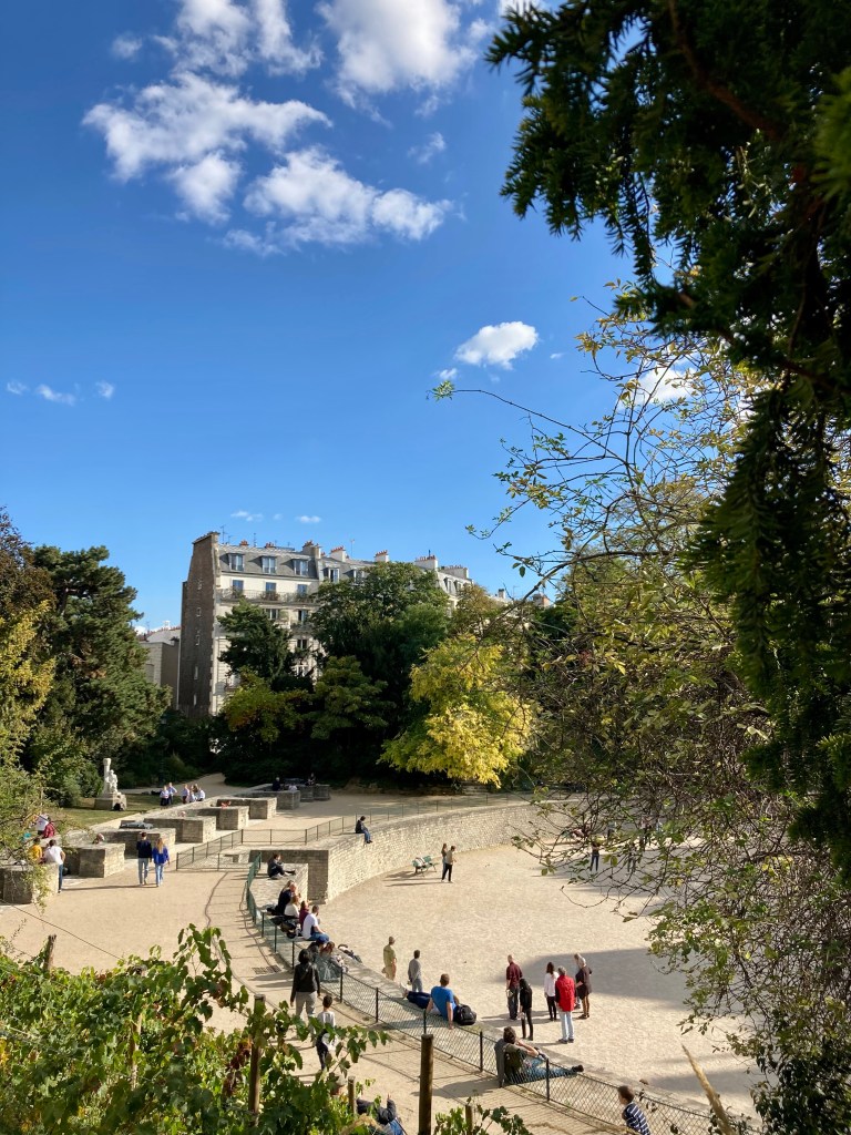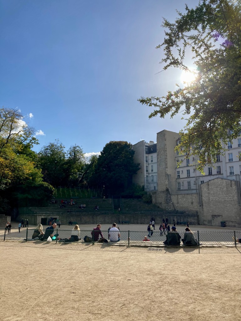 Come tutti i parchi di Parigi quando c’è il sole, le panchine erano occupate, persone stavano sdraiate sull’erba e, al centro dell’arena, immancabili gruppi di tutte le età giocavano a pétanque (una specialità delle bocce). Mi sono fermata anche io, approfittando del calore pomeridiano. Quando il sole ha iniziato a calare me ne sono andata e ho iniziato a camminare a caso per un’ennesima zona di Parigi a me ancora sconosciuta. Strade semi deserte costellate di targhe in ricordo di illustri abitanti (come Cartesio), di liberatori fucilati o di ebrei deportati portavano in strade in cui aumentavano i bistrot e i café fino ad arrivare alla affollata place de la Contrescarpe dove dai tavolini degli innumerevoli ristoranti si potevano osservare le riprese di un film. Sempre a caso ho svoltato in rue Mouffetard, un’altra di quelle vie che dicono “Parigi”.